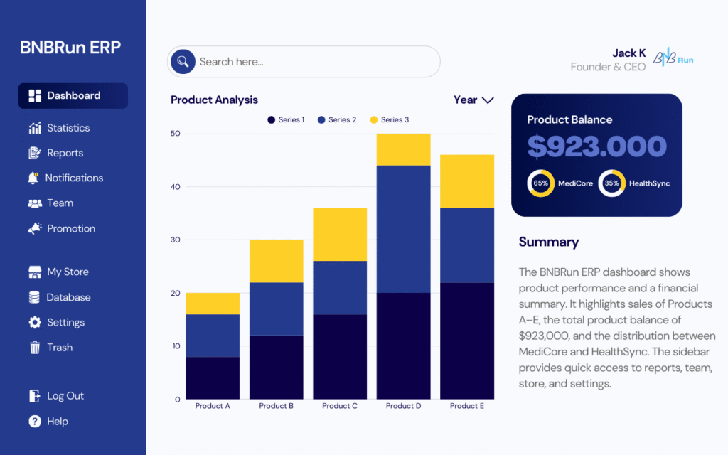 Easy navigation to reports, team, store, database, and settings and analyze product trends, balances, and summaries for informed decision-making.